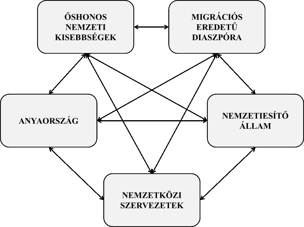 Rogers Brubaker háromelemes modellje (vö. triadic nexus), amely összekapcsolja a nemzeti kisebbséget, a lakóhely szerinti nemzetiesítő államot és az anyaországot, a diaszpórakutatás területén is alkalmazható, ez esetben azonban további két elemmel kiegészítendő. Egyrészt a diaszpóraközösségek, az őket befogadó államok és az anyaország mellett figyelembe kell venni a nemzetközi szervezetek ellenőrző, szabályozó szerepét (vö. quadratic nexus). Másrészt célszerű két különálló politikai mezőnek tekinteni a határváltoztatások következtében kialakult kisebbségi közösségeket és a migrációs eredetű diaszpóraközösségeket. E két közösségtípus különválasztása több szempontból is indokolt: (1) eltérő az intézményrendszerük; (2) eltérő a kapcsolatuk úgy az anyaországgal, mint az őket befogadó állammal; valamint (3) szervezeteik és érdekképviseleteik egymásra gyakorolt hatása is indokolja, hogy különálló konfigurációként tekintsünk rájuk. Ez utóbbi jelentősége szembetűnő a magyar diaszpóraszervezetek Magyarországtól elcsatolt területeken élő magyarok érdekében tett intézkedéseiben. Itt említést érdemel a Magyar Emberi Jogok Alapítvány, melyet 1976-ban alapítottak New Yorkban azzal a céllal, hogy segítse a Csehszlovákiában és Romániában élő magyarok kisebbségi jogainak védelmét. Ehhez a ponthoz tartoznak továbbá a nyugat-európai és tengerentúli magyar diaszpórából érkező anyagi támogatások a Kárpátalján élő magyarok megsegítésére. Az őshonos és migrációs eredetű külhoni közösségek különválasztásával egy ötelemes modellt – pentagonic nexus – kapunk. Itt fontos megjegyezni, hogy az ilyen és ehhez hasonló modellek (triadic nexus, quadratic nexus, pentagonic nexus) csak a vizsgált társadalmi jelenségek és viszonyrendszerek általános leírását teszik lehetővé. A közösségi lét szempontjából meghatározó helyi identitások rétegzetten plurális tartalmainak megismerésére nem alkalmasak